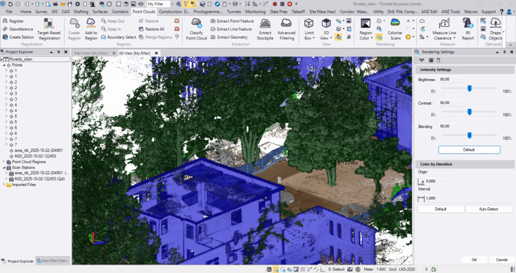 Sealt edasi saab andmeid importida Trimble Business Centerisse (TBC), kus neid analüüsida, luua lõikeid ja mahtude arvutusi ning integreerida GNSS- või tahhümeetriliste mõõtmistega. TBC-s muutuvad SLAM-andmed geodeetilise täpsusega väljunditeks – ühtseks, jälgitavaks ja koordinaatsüsteemiga täpselt joondatud tulemusteks.